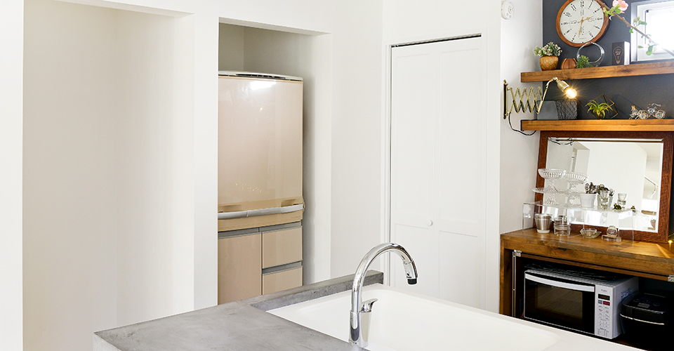 生活感が出てしまわないようにと、電化製品類は、リビングからの視線をカウンターでさえぎることのできる、低い位置に配置。冷蔵庫もあらかじめ場所を決めて仕切りを設け、リビング側からは見えにくくなっています。