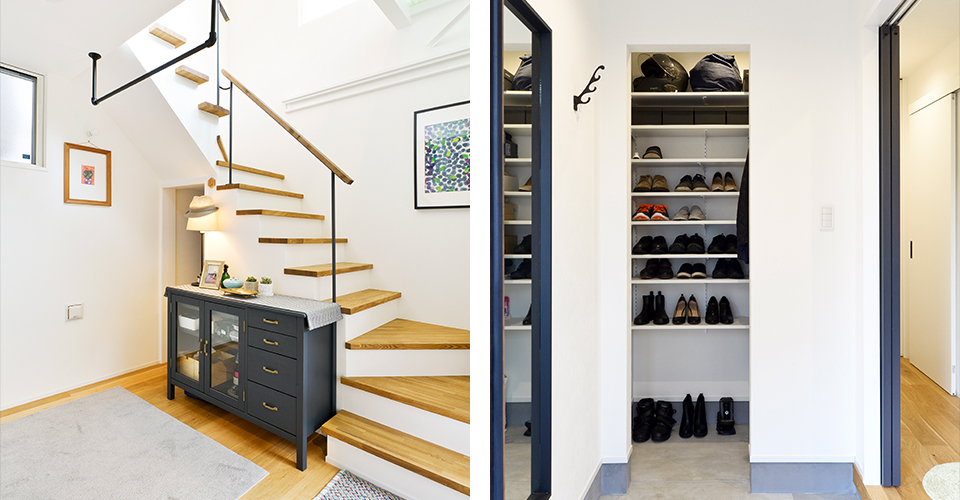 玄関スペースにはシューズクローゼットを配置。上がり框には引き戸を設置し、閉めて断熱性を高めることもできます。
