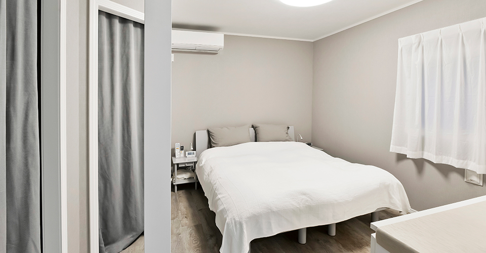 来客が多いS様ご夫婦。1階はプライベートスペースと位置付けています。1階の寝室は、あたたかみを感じるグレーで統一して、落ち着いた空間に。収納を充実させるため2カ所にウォークインクローゼットを設けています。湿気がこもらないようクローゼット内に換気口をつけるという工夫も。