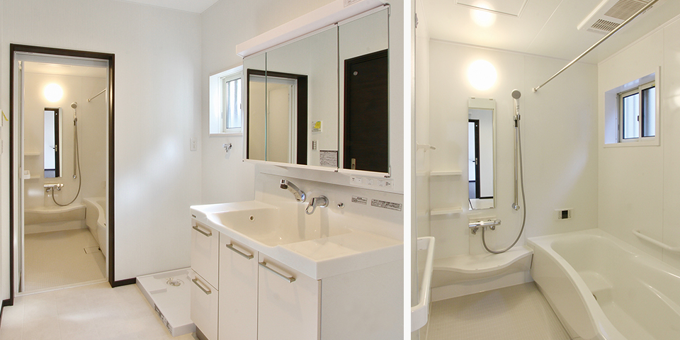 洗面台はトクラスEPOCH、バスルームもトクラスeveryでコーディネート。 / バスルームeveryは壁柄もバスタブも清潔感のあるホワイトでカラーを統一。