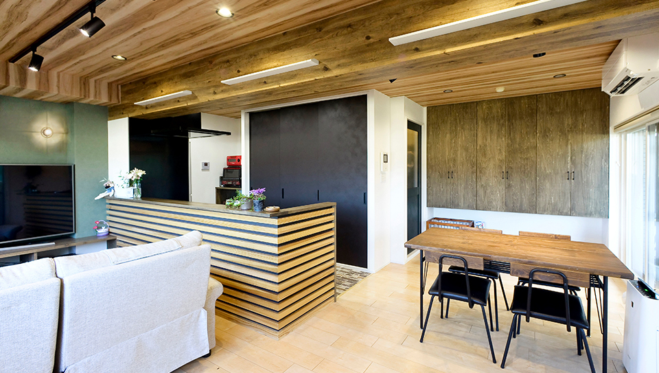 ご主人一番のこだわりがキッチンカウンター側面の意匠性。「LDKのシンボルになるように木材を貼りたい」というのがたっての希望でした。たくさんのサンプルの中から選んだのは、無垢杉。下地に黒のクロスを貼り、杉の質感をより際立たせています。「杉は香りも強くまさに森林浴をしているような気分になります。経年とともに現れる木の風合いの変化も楽しんでいきたいですね」とご主人。
