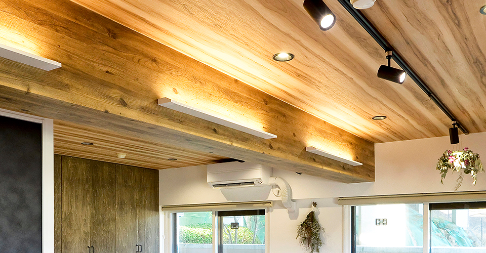 「山小屋」の雰囲気をより醸し出すため、天井には木目調のビニールクロスを貼りました。さらにマンションの構造上、手を加えられない天井部の梁をうまく利用して間接照明を設置。照明は、プランナーの提案にあったものを、照明関係の仕事をしているご夫婦が、自ら手配したもので、「お酒を飲む」「映画を観る」などのシーンに合わせて照明を変えられるのが特徴です。