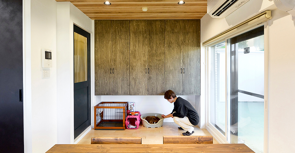 キッチンと隣接するダイニングの収納下部には、愛犬モカちゃんのケージがすっぽりと収まるリラックススペースを確保。フローリングはひっかき傷に強いシート張りのものにしたので、元気に走り回っても安心です。