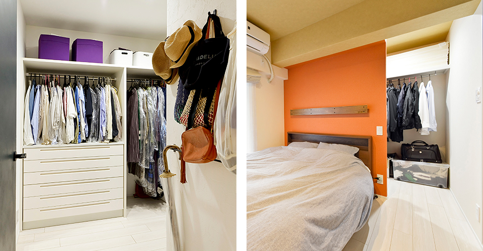 LDKの改装に加えて、ご夫婦ともに希望していたのがウォークインクローゼットでした。そこで、かつての子ども部屋を丸ごとウォークインクローゼットに。奥さまの和服を収納する引き出し、丈の長い服もそのまま掛けられるスペース、小物をしまえる棚など、多種多様なものがすっきりと収納できるつくりになっています。あわせて寝室にも、ご主人専用ウォークインクローゼットを設けました。