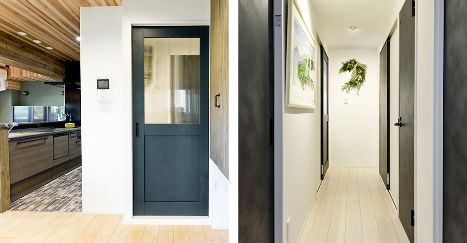 また、それぞれの空間でそれぞれ完結するのではなく、住まい全体のカラーコーディネートにこだわっているのも、S様邸の特長。例えば、ドアはキッチン背面の扉と同じ色・素材を使い、統一感を持たせています。