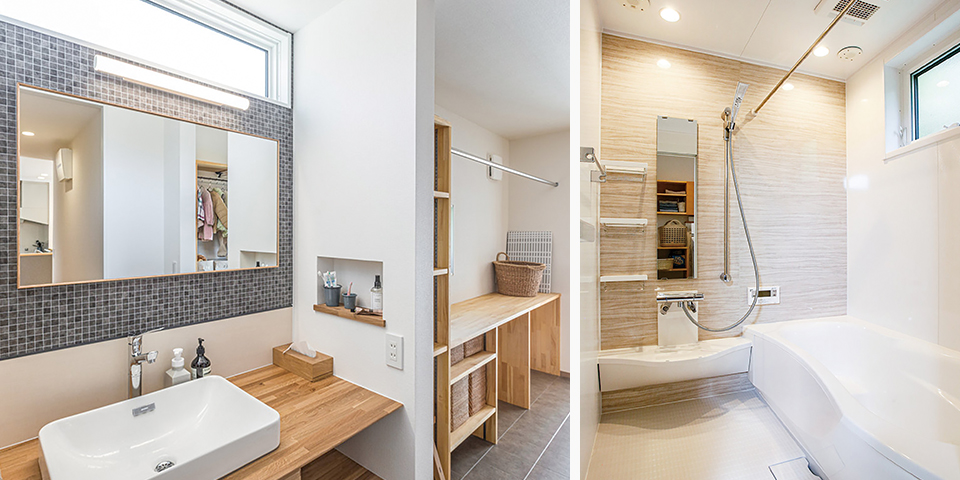 洗濯したらすぐ楽に干せる便利な洗面所〜洗濯干し動線。 / お風呂で好きな音楽が聴けるので楽しく充実したバスタイムに。