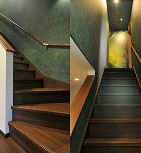 暗く急勾配だった階段は緩やかな廻り階段にリフォーム。深い森の中をイメージした緑の壁紙。
