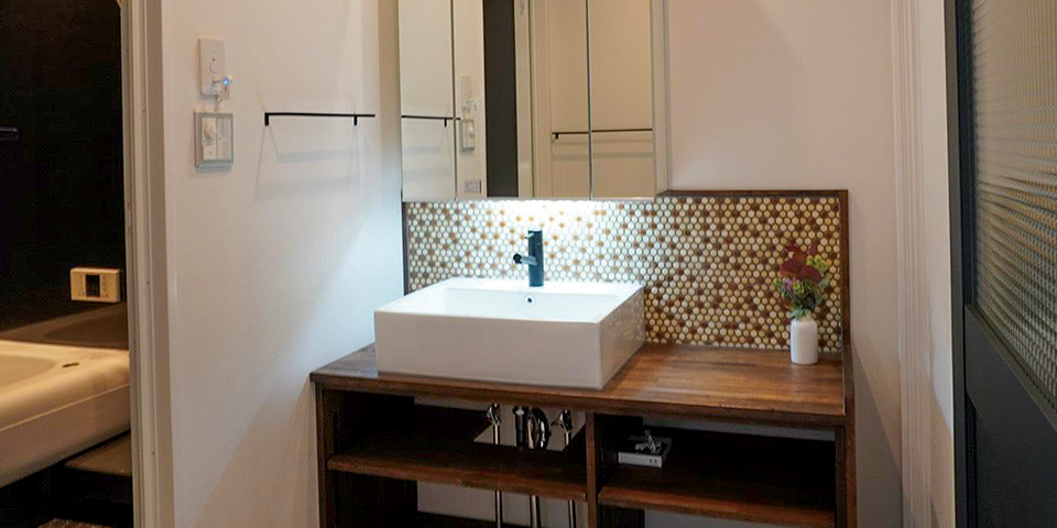 お気に入りのタイル造作洗面台と入浴時間を音楽とマイクロバブルでゆったり過ごせる浴室。