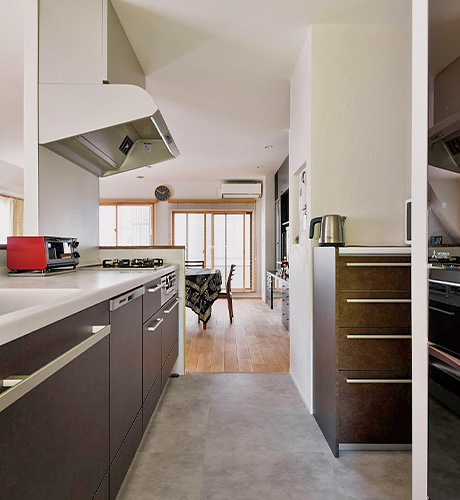 キッチンは左右・後ろにも抜けられるI型の配置で、リビングにも寝室にもアクセス可能。