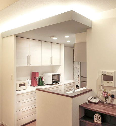 張り出したキッチンに合わせて天井も伸ばし間接照明で美しく。