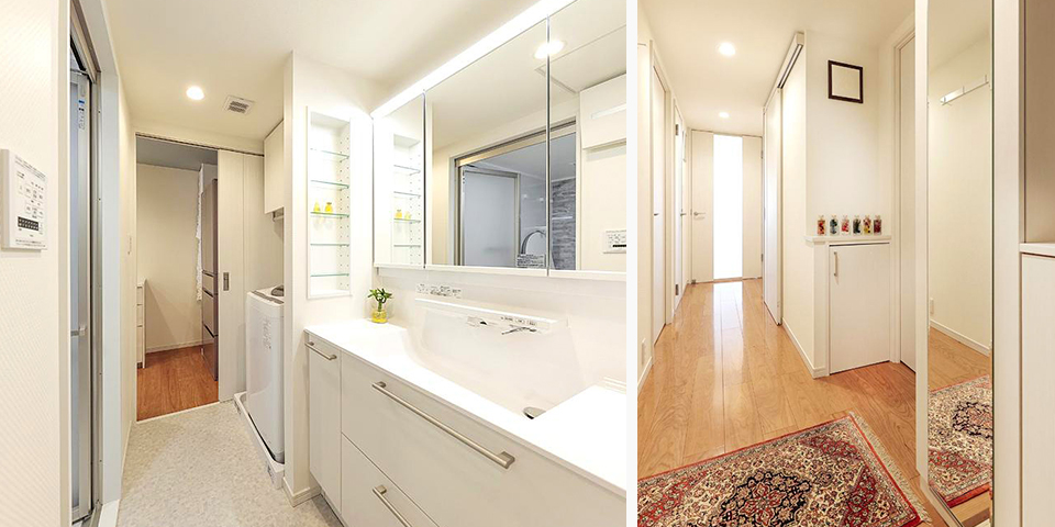 廊下からキッチンにつながる浴室・洗面スペース。 / 以前はブラウン系の玄関をホワイト系に明るく。