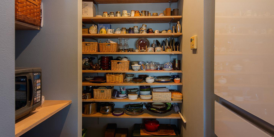 ●大好きな料理をしながら音楽がきけるように天井埋込スピーカーを付けたり、キッチンから景色を眺められるように室内窓をつけたり、これからの人生を思い出のつまったモノ達と豊かに過ごしていただけるように考えた。