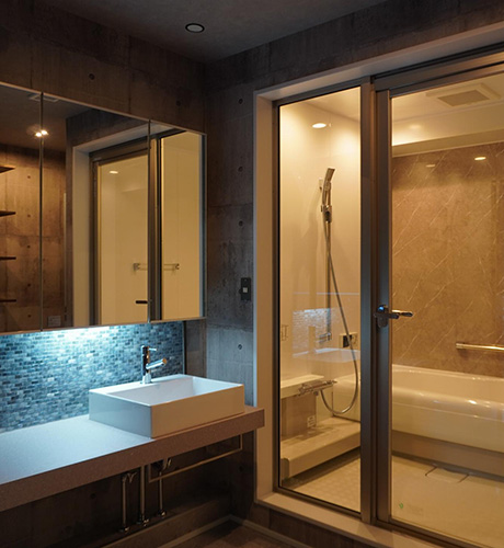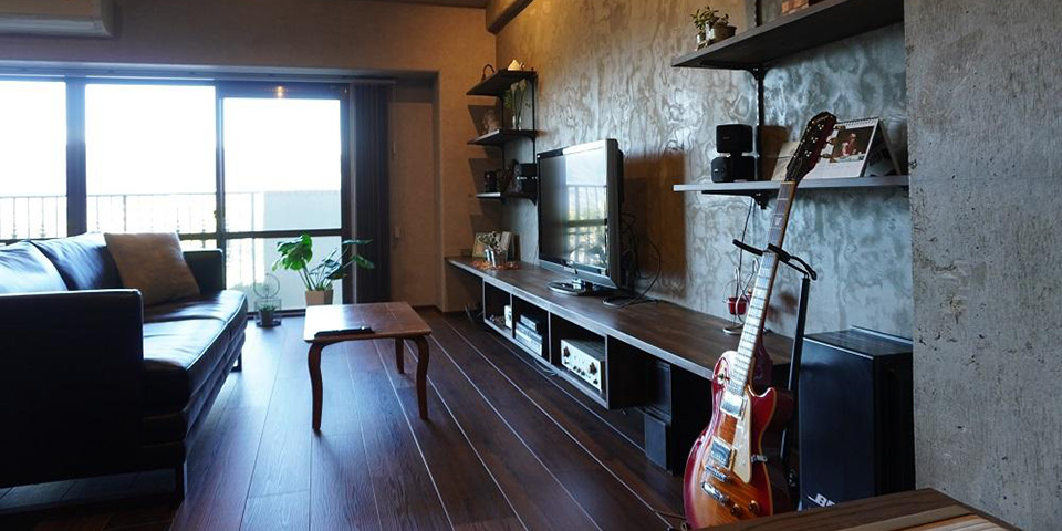 ●広いLDKは打放しコンクリートの天井と壁で、イメージの内装に仕上げ、音楽を楽しめるように、機材の設置に合わせたTVボードも造作。渋めの色合いとイタリア漆喰、オリジナルステンドグラスパネルを施した小上がり和室も配置することで、ゆったりと過ごせる空間にした。