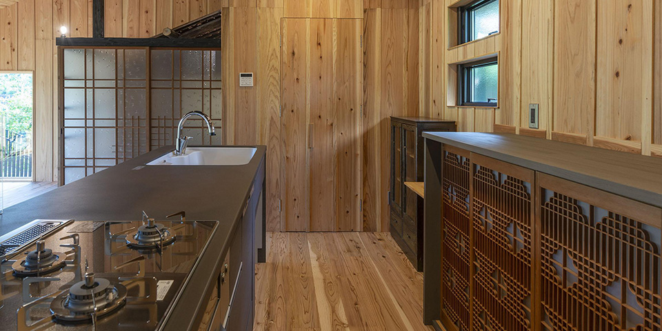 伝統的な古民家の趣はそのままに、卓越したデザイン力で荘厳さをも感じさせる新しい空間へと昇華させています。床、天井、窓、家具、キッチンなど、それぞれの高さのバランスが美しく整えられ、全ての部屋に洗練された落ち着きを感じます。繊細な組子と古材に溶け込むシックなキッチンの組み合わせの美しさに目を奪われます。
