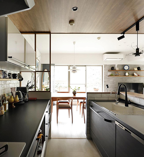 LDKはどこからでもパークビューが楽しめることを意識してプラン。キッチンから続く木目の天井でメリハリのある空間に。