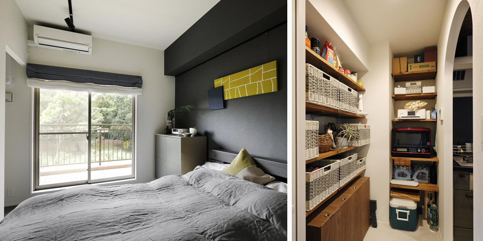 寝室はブラックのアクセントクロスで落ち着いた空間に。 / 玄関〜キッチンの動線上にはSICとパントリーを新設。