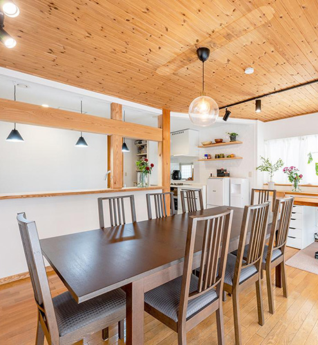 筋交いを現しにして壁を無くし、ダイニングとリビングを一続きの空間に。