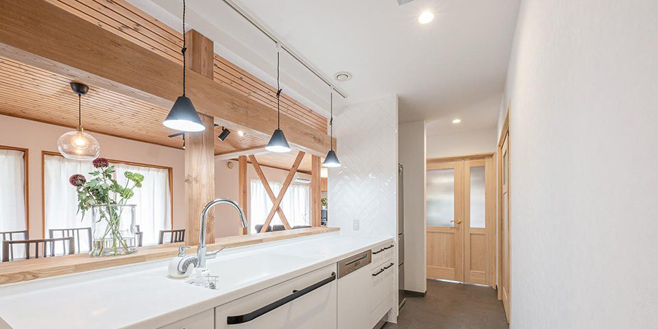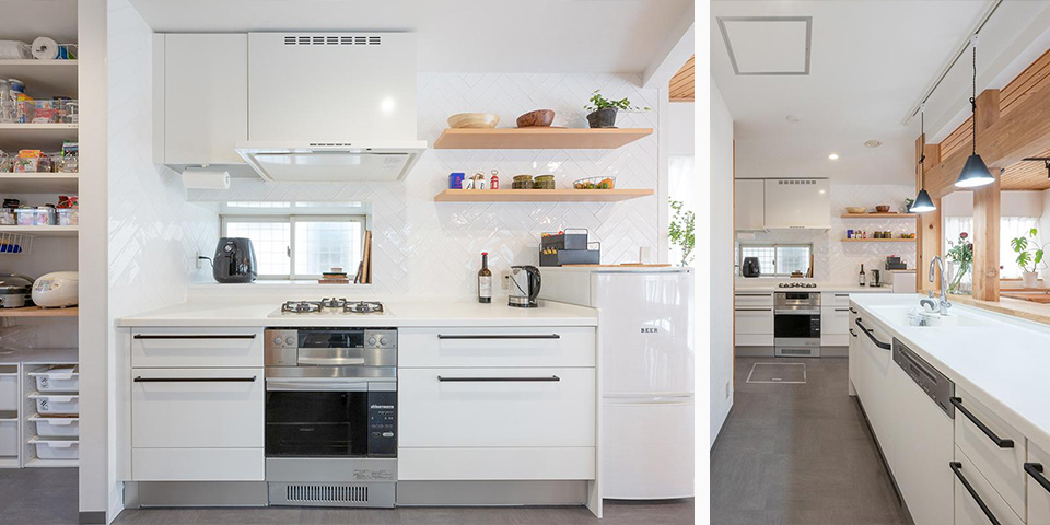 また絶妙なバランスで取り入れた自然素材が白色のインテリアを更に美しく際立たせていて、やはず貼りのキッチン壁タイルが空間の楽しいアクセントになっています。