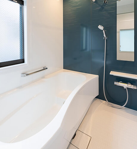 壁の一面にシックな色合いを選び、清潔感と明るさを確保しつつ、落ち着いたバスルーム。
