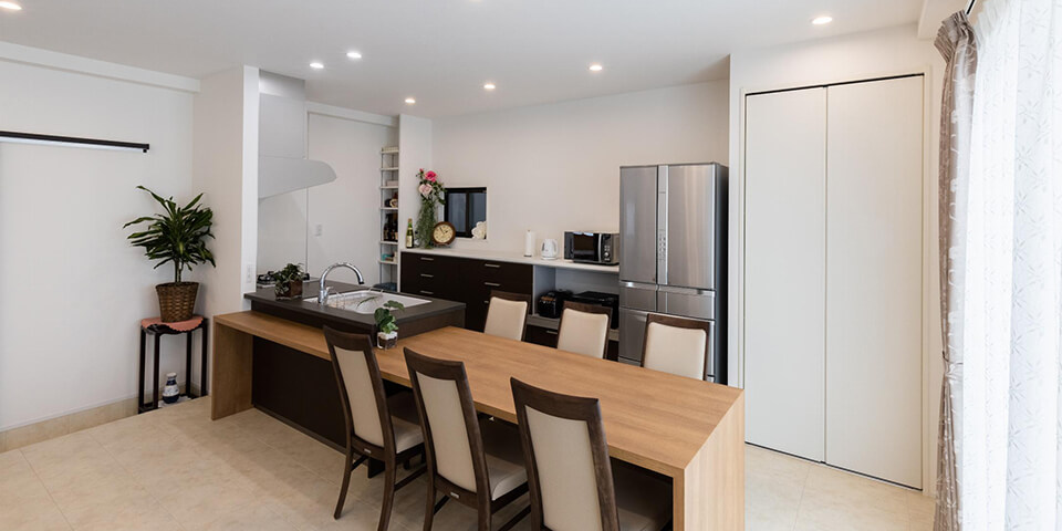 広々として快適なLDKは収納にも配慮。キッチンの傍には使い勝手の良いパントリーを造作し、キッチンやカップボードの存在感を引き立てている。