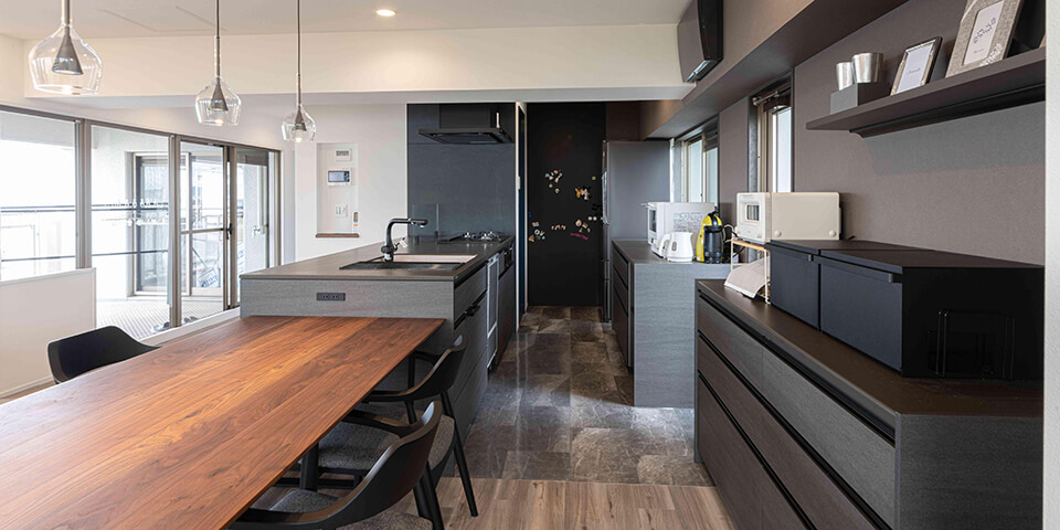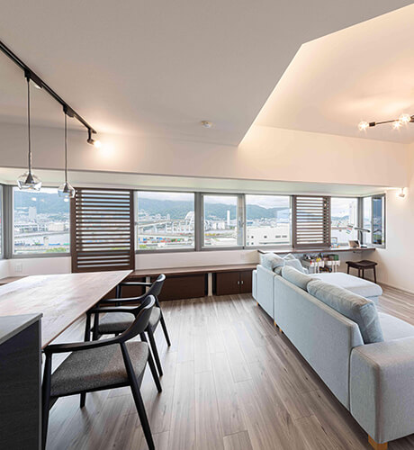 今回2回目となるリフォーム。新しく購入された中古マンションは、眺望の抜け感が最高。神戸ならではのロケーションが楽しめるマンションを買い、神戸らしい風景を活かし、みんなが集まって楽しい時間を過ごせる空間を希望。