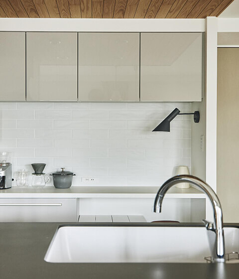 背面収納もトクラス。グレーの収納扉には美しい光沢のピアノ塗装。半面、壁にはマットな質感の平田タイル、「サブウェイ」を。