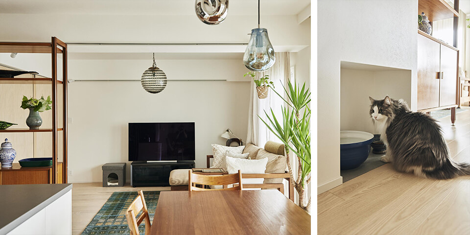 仕事に集中できるスペース、好きな料理を作って食べられるスペース、たくさんのワードローブが一気に片づくスペースと、念願はすべてかないました。大好きなインテリアに囲まれているのも心地いい。観葉植物を育てるという新しい趣味もできました。何より、猫たちが楽しそうに過ごしているのがうれしく、トンネルをくぐる姿を最初に見たときの感動は忘れられません(笑)。私たちも猫とたわむれながら、毎日をゆったりと過ごしています。