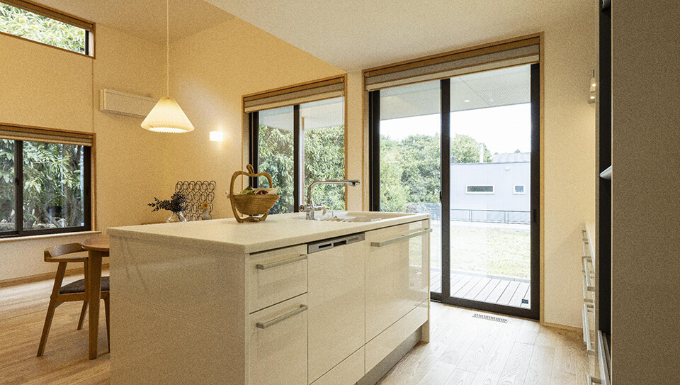 アパート暮らしの時は夏の暑さと冬の寒さに辟易していましたが、外張り断熱の家は冬の底冷えがなく、夏はエアコン一台でサラリと快適です。家事動線も水回りが集中しているためスムーズで、なによりキッチンが広くて使いやすくなったのが嬉しいです。また、これまでは物がいっぱいで置き場所にも困る状態でしたが、収納をたくさん作ってもらったお陰で掃除が楽に。家事ストレスが大幅に減りました。上の子も部屋で勉強するようになり、休日には友達を招いたり、家族でバーベキューをしたりと楽しんでいます。