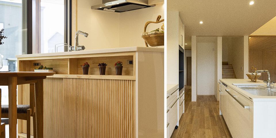 デザインは造作家具も木目も縦のラインを統一することでスッキリとした印象に。 / 休日は夫婦や子ども達と一緒に料理を楽しむことができる、ゆったりと使いやすいキッチン。
