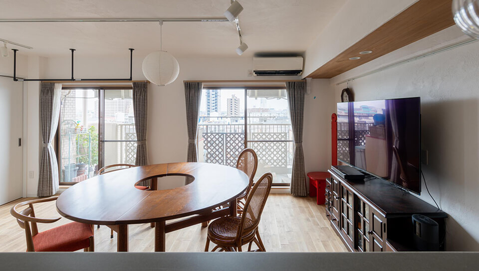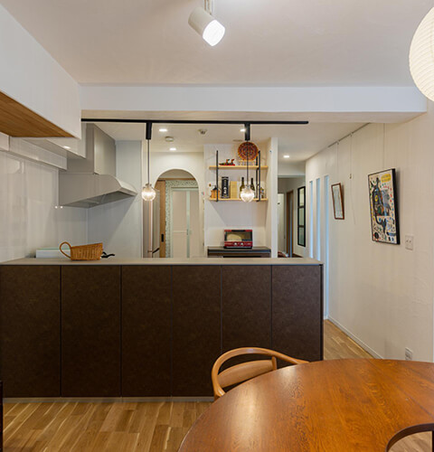 設備機器の老朽化をきっかけに、長年溜まった不満を解消したい!とリフォームの検討。「とにかくキッチンが使いにくい。」、「夫婦それぞれのプライベートも確保したい。」、「思い入れのある家具を残したい。」、「コレクションを飾れるアートな空間が欲しい。」などの悩みを全部解消できるように打ち合わせをたくさん重ねた。
