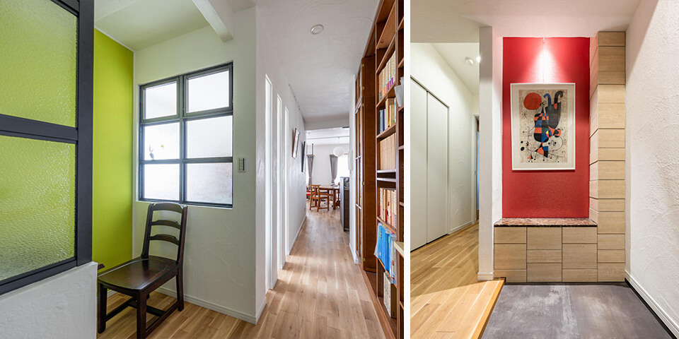 東側の窓から自然光を取り込んだ、明るいヌックと本棚。奥にはアートを飾るギャラリースペースも。 / トイレの排水スペースを利用して、玄関ギャラリーを。ご主人の大切なポスターが映える。