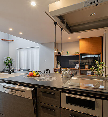 重厚感がありながらも、ナチュラルで軽やかな印象がある子世帯のLDK空間の中心的存在はベリーキッチンです。食器棚の壁面には白いタイルの「やはず貼り」でさりげないアクセントにしたり、美しくバランスのいい照明計画がされていたりなど、随所に心憎いほどの心配りがされています。テノールカウンターの質感がベストマッチをしている作品です。