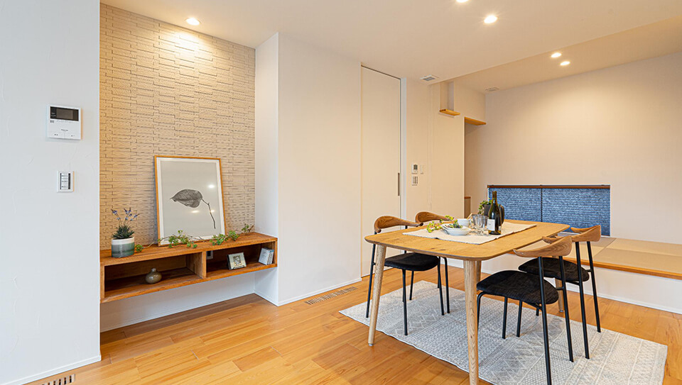 親世帯ダイニング:白を基調とした明るい空間。テレビ台をフロートタイプとすることで日々のお掃除も簡単に。