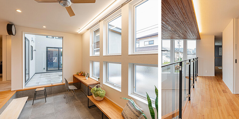 ●吹抜けは三方を窓とすることで抜群の開放感を感じられるように工夫。