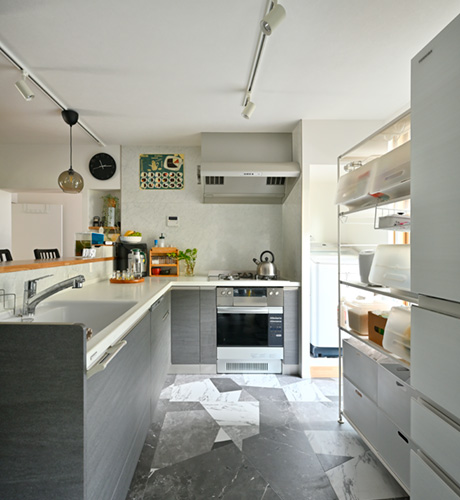 元々隣接していた洋室をダイニングキッチンへ取り込み、ゆったりとした空間に。床はロイヤルストーン調のフロアタイルを採用し大胆で個性的な空間となった。