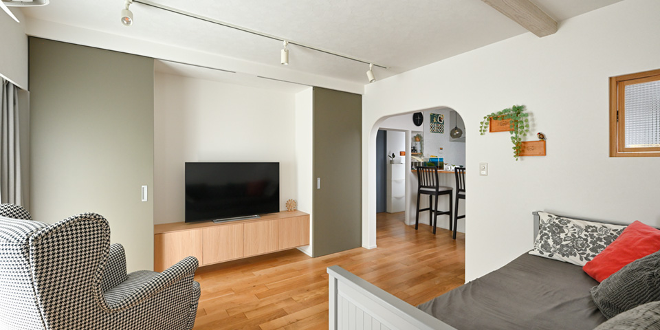 元々あった和室の一部を取り込んで広くしたリビング。 壁面には収納を設置。収納扉のカラーはグレージュにして、リビングの優しいアクセントとなった。