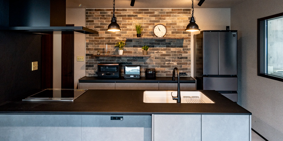 壁面にヴィンテージ風のタイルを用いたキッチンスペース。