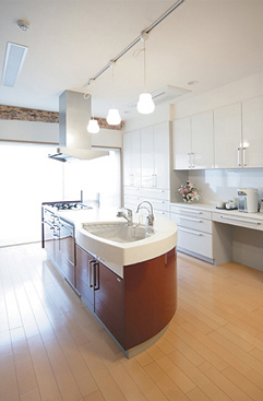 「台所は壁側にあるべきだ、と思っていましたから、真ん中に置くのは抵抗感がありました」とお母さま。Hさんも「レンジフードが天井から下がってくるのはどうかなと思った」とのこと。しかし、収納、キッチン、収納と川の字にレイアウトすることで、結果的には収納スペースを多く取ることができ、また、お母さま、奥様、お嫁さん、あるいは奥様、お嫁さん、おふたりの娘さんが集まって料理をしても、動線に無理がないゆとりのキッチン空間ができて、満足されているとのことです。