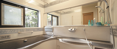 洗い場を広くとったバスルームは、使い勝手だけではなく、“リゾート性”も追求。立派な竹の庭が見れるように窓の位置を変更。ミストやアクアマッサージ、アクアライトやアクアソニックなど、ヤマハのシステムバスならではの機能も採り入れました。