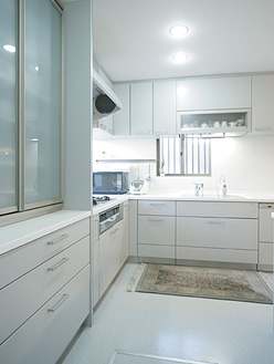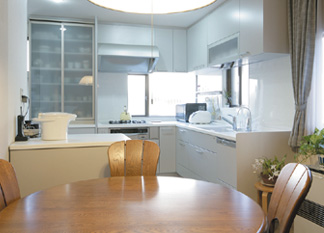 奥様が悩まれたのは、キッチンを対面式にするか、壁付けのL字型にするかということ。「手前にシンクのカウンターを設けた対面式のものも良いと思ったのですが、背面がガスコンロになると、年をとってうっかりして背中に火が移ったりすると怖い。後藤建設の薦めもあって結局L字型のキッチンにしました」と奥様。IHクッキングヒーターも検討したが、ガスの方が使い慣れていることと、ガスコンロもどんどん使い勝手が良くなってきていることから、ガスコンロのタイプを選ばれました。「間取りは全然変わっていないのに、オープンにして明るくなったせいか広く感じます」とNさん。奥様がカウンターで作業をしながら、ダイニングにいるNさんとコミュニケーションができるので、会話も自然と弾むようになったそうです。