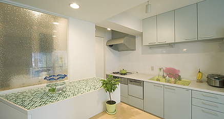 時間をかけてようやく納得できるものを探したこのシートは、光を受けると小さな粒子のようなものがキラキラと光り、まるで虹のように見えます。これには小学生のお嬢様も大喜び。結果として、リビング側から見た時は空間のアクセントとなり、視線を遮りながらも洗面室に自然光を取り込むことに成功。また、ナチュラルなトーンのカウンターに置かれた白いスクエア型の洗面ボウルと、ガラスを通して光る明るいガラスは、マンションとは思えない程の開放感を感じさせます。
