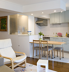 「家族が一緒にいるスペースが欲しい」という、Nさんのいちばんのご要望を叶えながら、マンションリフォームにおいて求められる開放感、収納、採光の課題を見事にクリアしたプラン。リビングはもちろん、キッチンに立つ時も、洗面室に居る時も常に家族の気配を感じながら、3人の暮らしを楽しまれているNさんご家族です。
