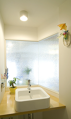 そこで、なるべく有効に太陽の光を取り込めるようにと提案したのが、洗面室のコーナー壁をガラスにすること。ところが、この方法では洗面室には光が届きますが、リビング側から中が丸見えになってしまいます。しかし、どうしても水回りに光を取り込みたいという思いから、試行錯誤を繰り返し、解決策として質感のあるカッティングシートをガラス面に貼ることにしました。