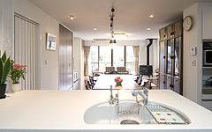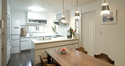 プランニングを担当したオフィスI.D.A.の井田さんは、リビング・ダイニング・キッチンの空間を広げるとともに、室内に光を導き、庭の緑を視覚的デザインに採り入れるため、和室と縁側をなくし、窓を効果的に配することを提案。すっきり感を出すために窓枠を天井まで伸ばし、昼間でも電気を点けないと暗かったキッチンが明るくなり、お料理をしながら庭の緑が望めるようになりました。