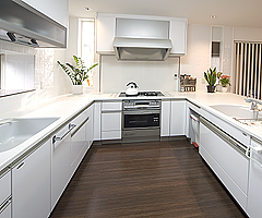 広くなったキッチンに導入したのは、ヤマハのシステムキッチン「ドルチェ」ピュアタッチシリーズ。キッチンもストッカーも、扉の質感や色が統一でき、サイズも調整可能だからと、井田さんが薦められました。ご家族みなさんでヤマハの東京・千葉・長岡のショールームをはじめ、他社のショールームにも足を運び、機能・デザインなどを検討された結果、「他にはない」ということで納得してこのキッチンに決められたそうです。色は奥様の好きなホワイトで統一し、爽やかな印象に仕上げています。