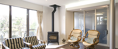薪ストーブの炎が穏やかに揺らめくリビングは、家族の心もゆっくりと温めるくつろぎの空間