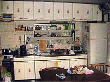 キッチンの食器棚は飛騨家具のオーダー品。補強を兼ねた大きな丸太の梁とあいまって、木ならではの温かみを醸し出す。壁・天井に調湿・脱臭効果のある珪藻土を使ったので、結露の悩みもペットの臭いもなくなった。