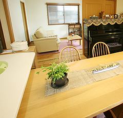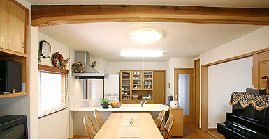 飛騨家具も手掛ける家づくり工房木楽にとって、自然素材は得意分野。床にはパイン材、壁・天井は珪藻土を採用して、食器棚も飛騨家具のオーダー品にするなど、体に優しく自然の風合いあふれる空間を創り出しました。飛騨家具とパイン材とは色合いの相性も非常に良く、ダイニングに備え付けたテーブルも、素材感豊かな空間に見合う木製のものを選びました。