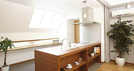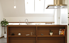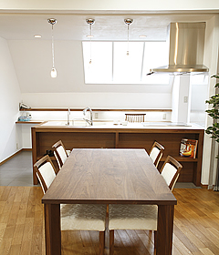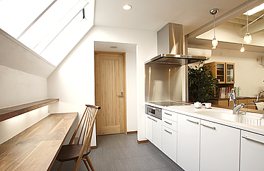 キッチンの床は、水がこぼれても掃除しやすいようタイルに。壁側には、同じく造作の木製の板を渡したカウンターが設置してあります。これは、いわばミセスのための家事コーナー。料理の際にお皿を並べて作業台として使うもよし、レシピ本や雑誌、パソコンを置いて書斎代わりに使うもよし、さまざまな用途で利用できる奥様のための自由なスペースです。傾斜天井を活かしてトップライトが設けられているので、昼は照明を点けなくても採光は十分。夜は、カウンターに取り付けられたライトがあたたかく手元を照らします。
