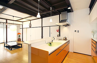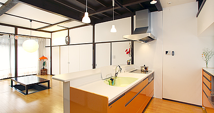 和のあたたかみと洋のキッチンの暖色系が統一感を生み出す、